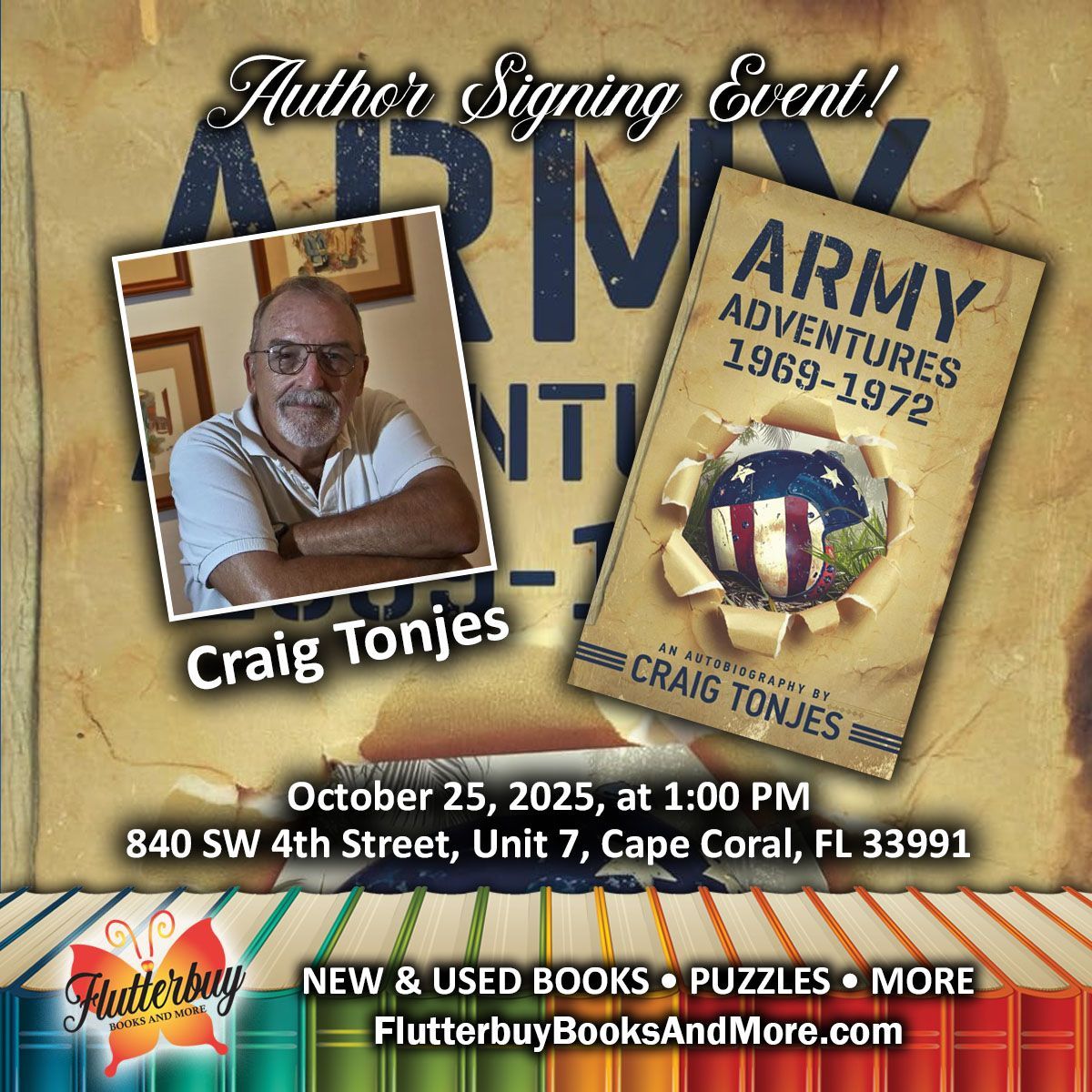 We’re excited to welcome Craig Tonjes to Flutterbuy Books and More on Saturday, October 25th at 1:00 PM for a special book signing event featuring his powerful new memoir: Army Adventures: 1969–1972.