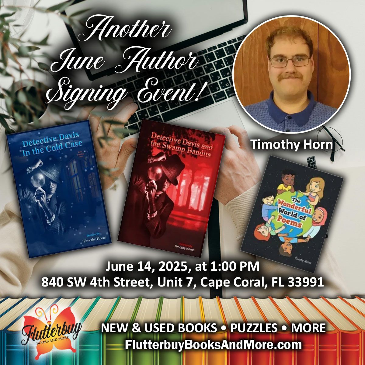 Looking for something fun (and free!) to do with the kids now that school’s out for summer? Swing by Flutterbuy Books and More this Saturday from 1:00–4:00 PM for a special Author Signing with Timothy Horne!